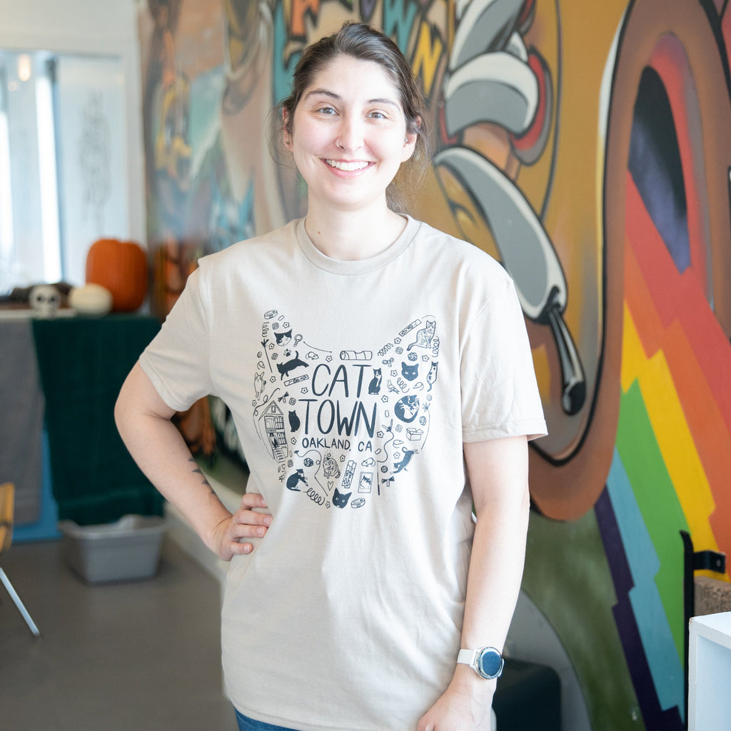 Our 2023 T-Shirt Design Contest winner — designed by San Francisco Bay Area based artist Ann Marie Itamura! Featuring Cat Town alumni and current residents, popular toys and treats, and everyone’s favorite mayor, this shirt design is truly all things Cat Town.